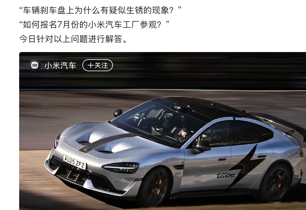【环球网科技综合报道】6月14日消息,近期有小米汽车用户发现车辆刹车盘上出现疑似生锈现象,对此,小米汽车官方在社交平台作出了回应。